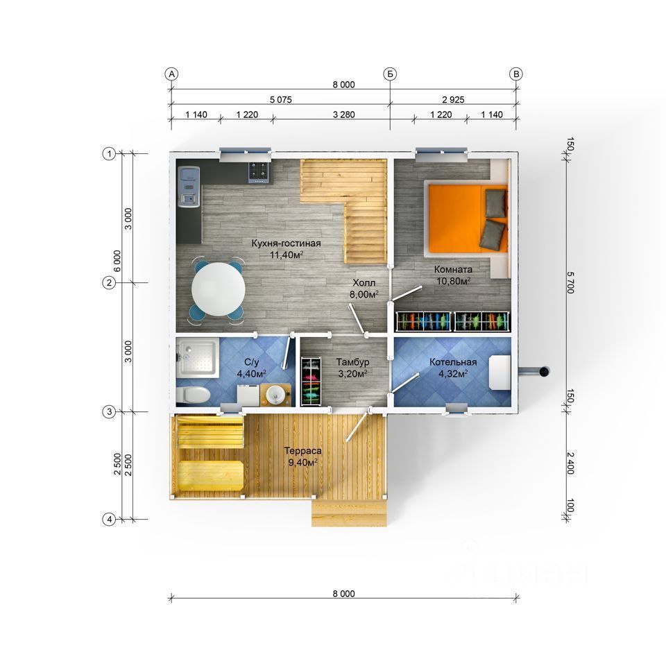 Дом 97 кв. М на участке 8 соток. В доме кухня площадью 11,4 кв. М, терраса 20 кв. М, три комнаты (10,8 кв. М на первом этаже и две по 15,68 кв. М на втором этаже), 2 санузла, холл и техническое помещение.